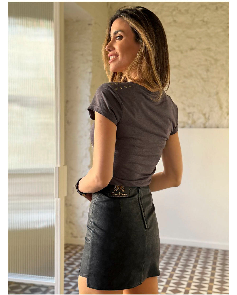 Camiseta de manga corta color gris carbón, modelo Kalanoche con detalle de diseño en tachas sobre el pecho, decorado con tachas color cobrizo, de la marca Camaleónica.