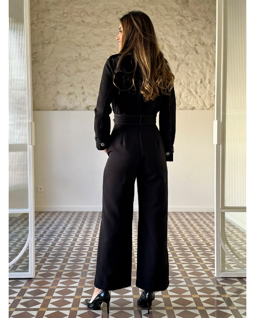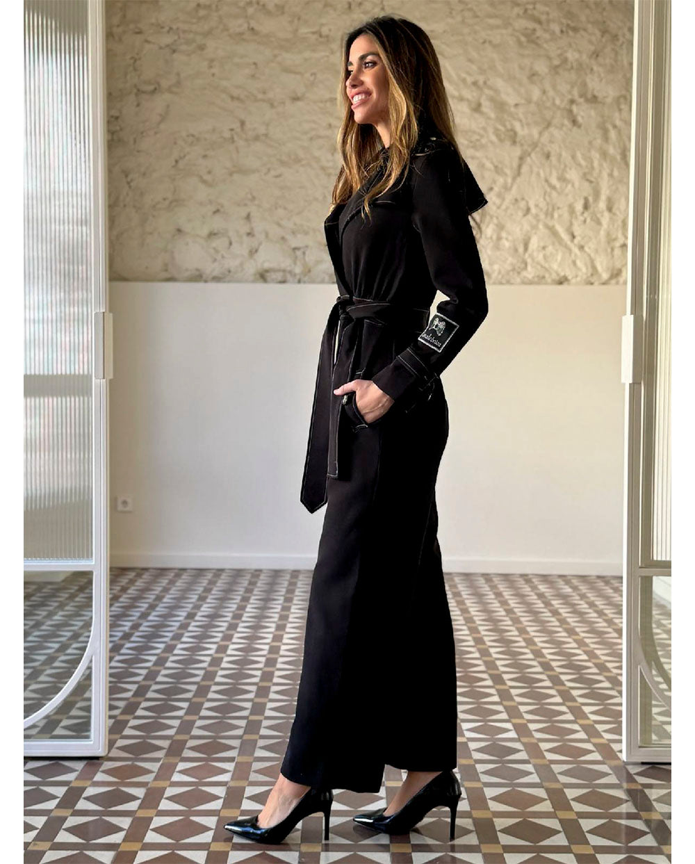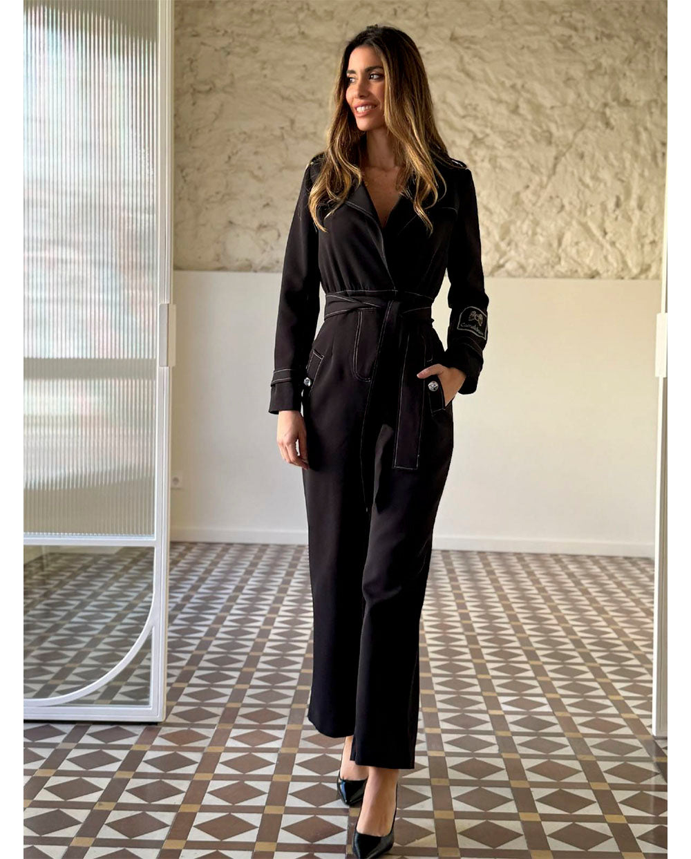 Mono casual largo en color negro con pespunte en blanco, trabillas en hombros y puños. Pequeña capa en parte superior de la espalda. Escote en pico cruzado. Cinturón atado con lazada del mismo tejido. Pantalón ancho con bolsillos laterales. Detalle botón marmolado. Logo de la marca en la manga.