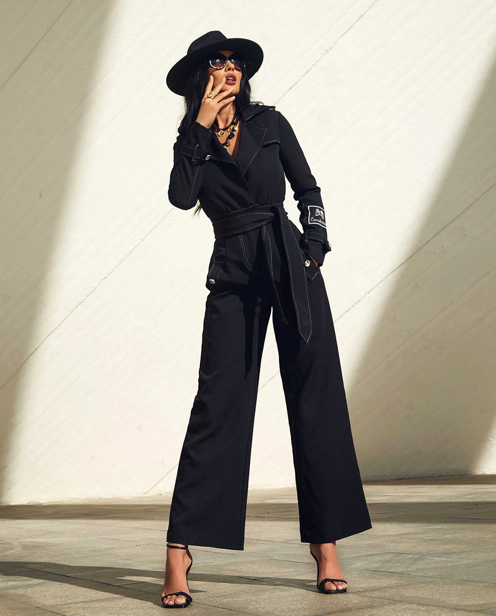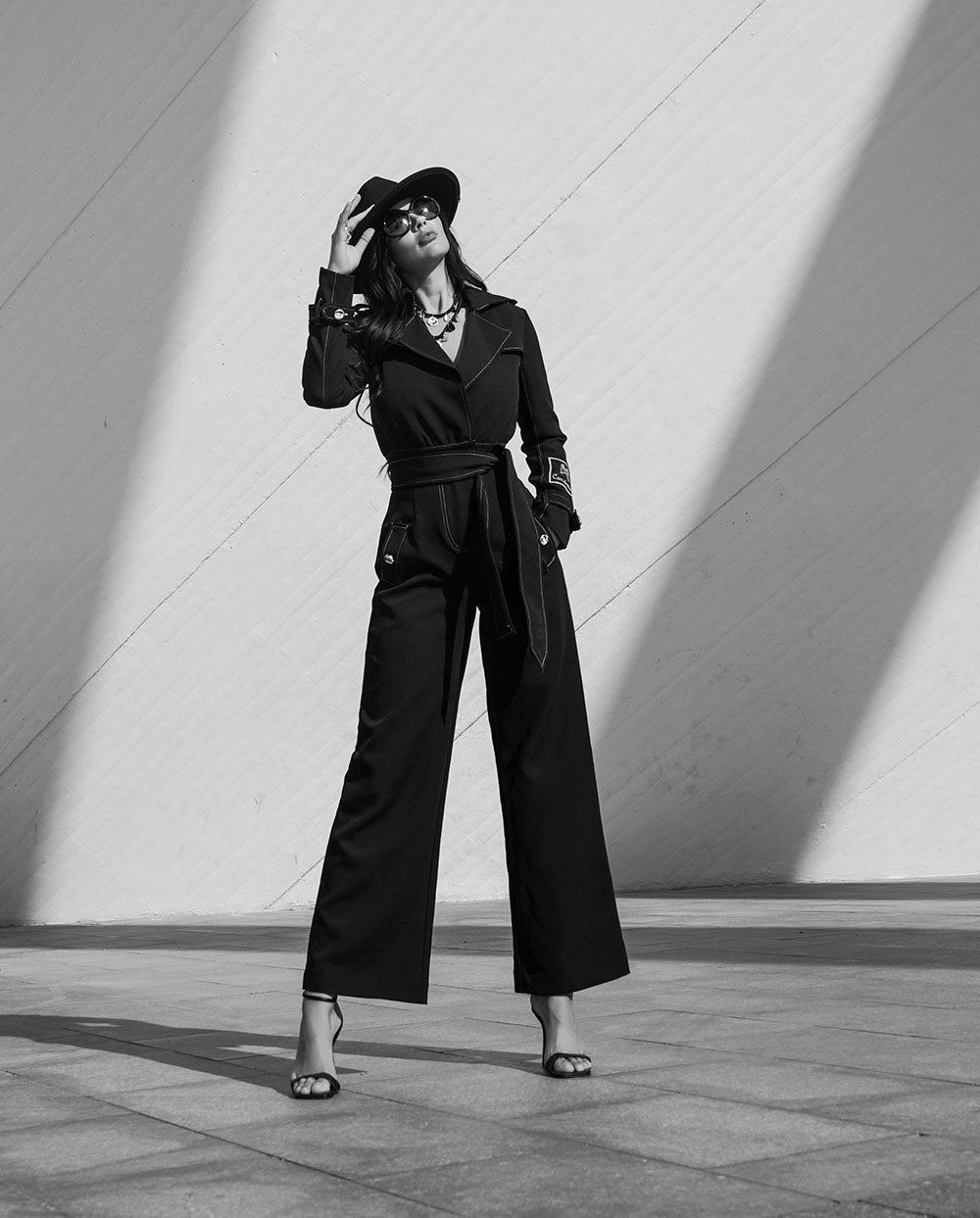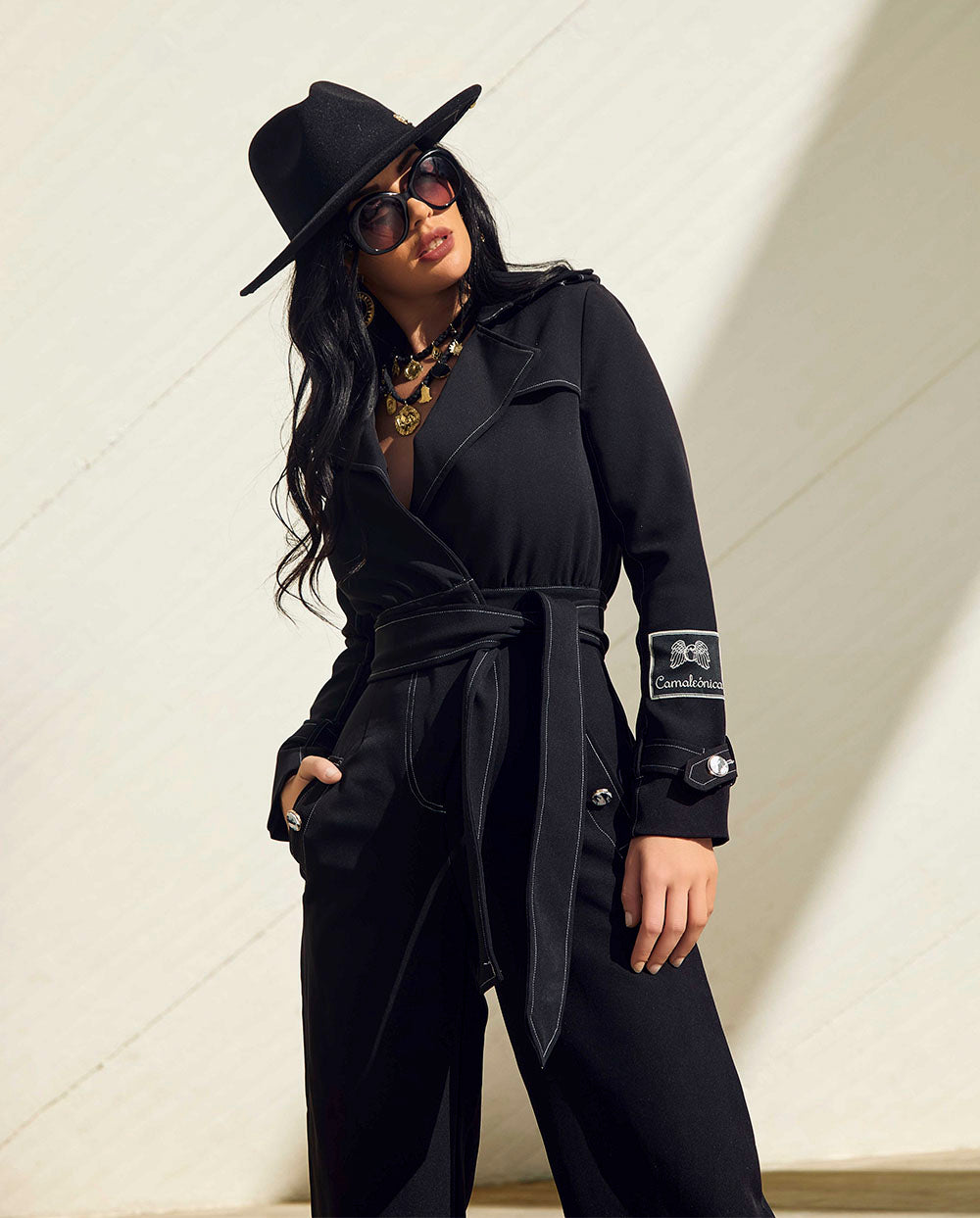 Mono casual largo en color negro con pespunte en blanco, trabillas en hombros y puños. Pequeña capa en parte superior de la espalda. Escote en pico cruzado. Cinturón atado con lazada del mismo tejido. Pantalón ancho con bolsillos laterales. Detalle botón marmolado. Logo de la marca en la manga.