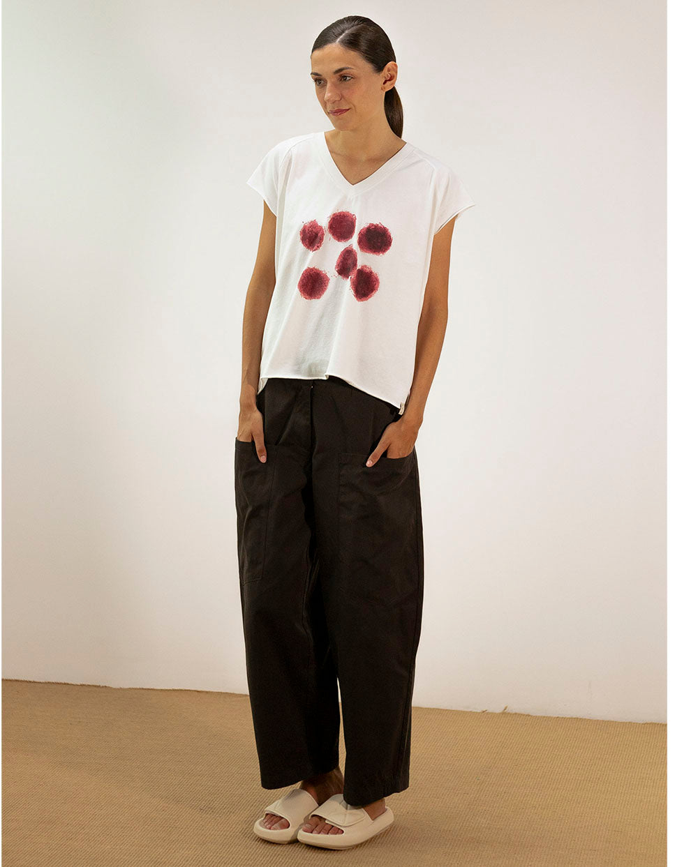 Camiseta de algodón blanca con escote pico y manga caída, decorada con diseño de cerezas pintadas en el frontal.
