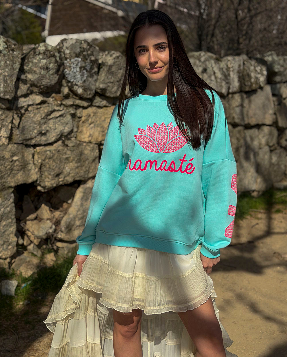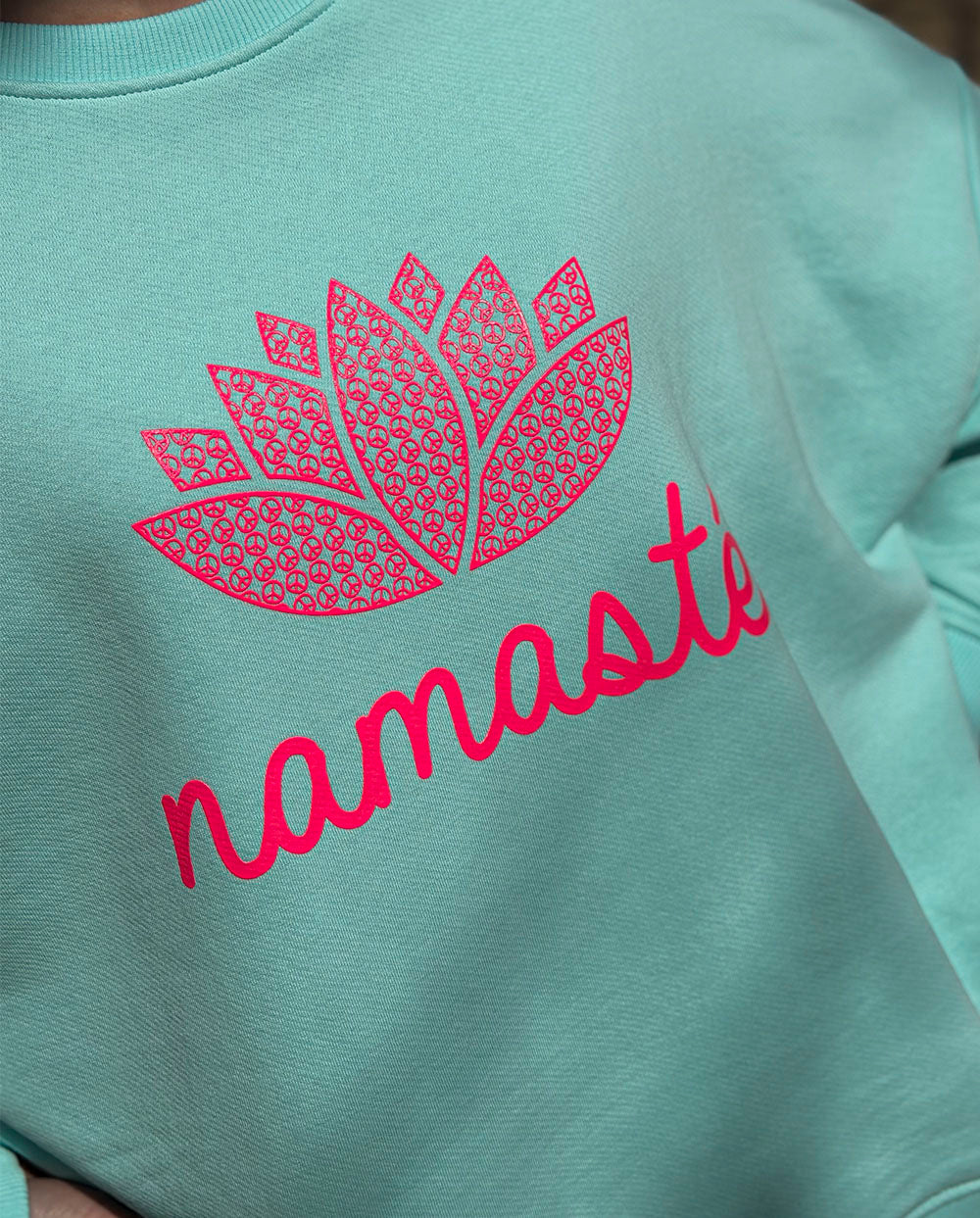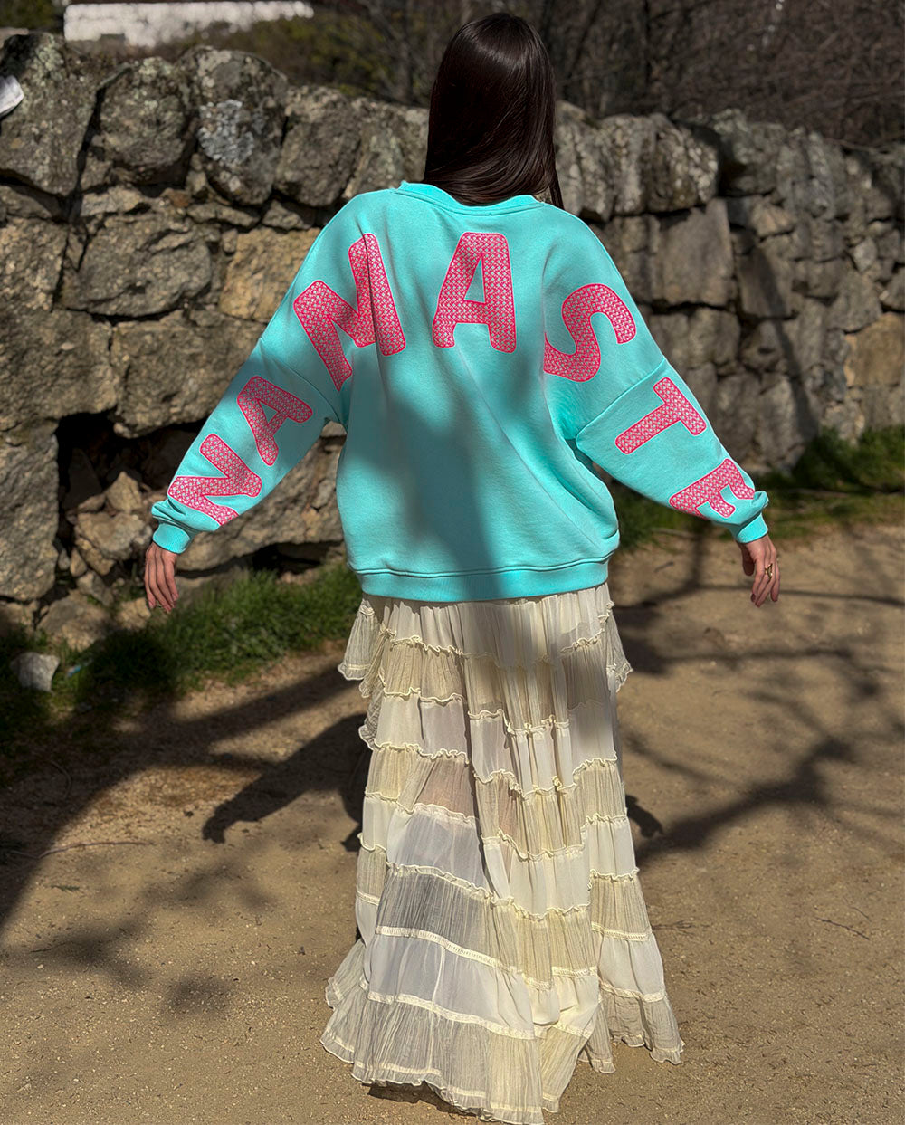 Sudadera Namaste Peace en color azul aqua con estampado rosa neón por delante y detrás recorriendo las mangas el mensjae Namaste ¡un espectáculo!