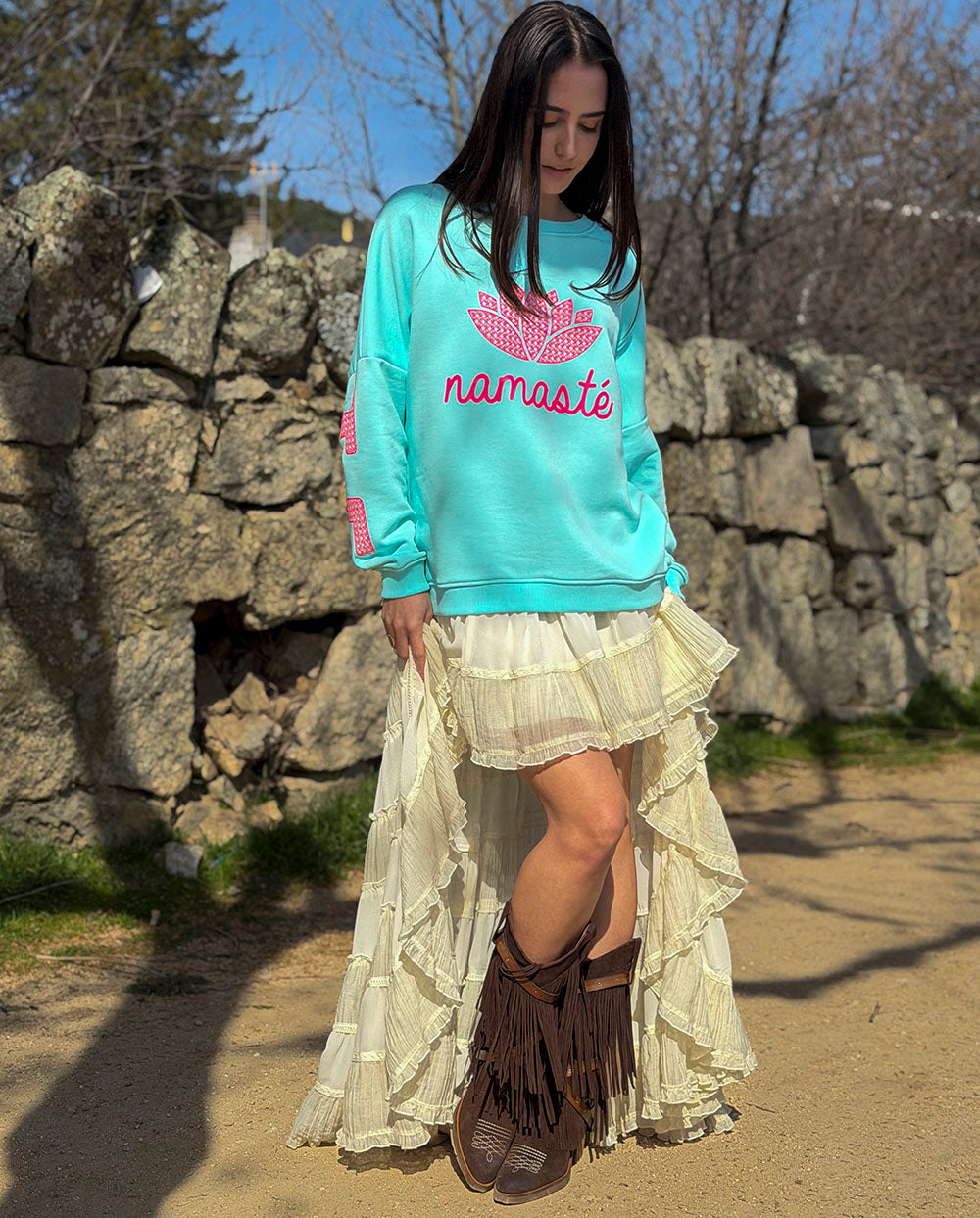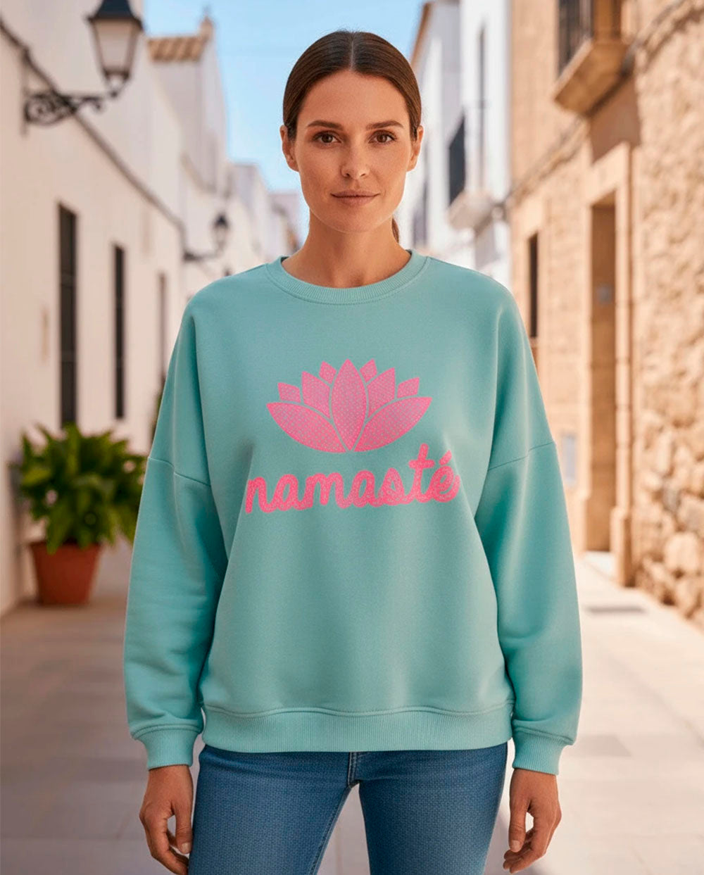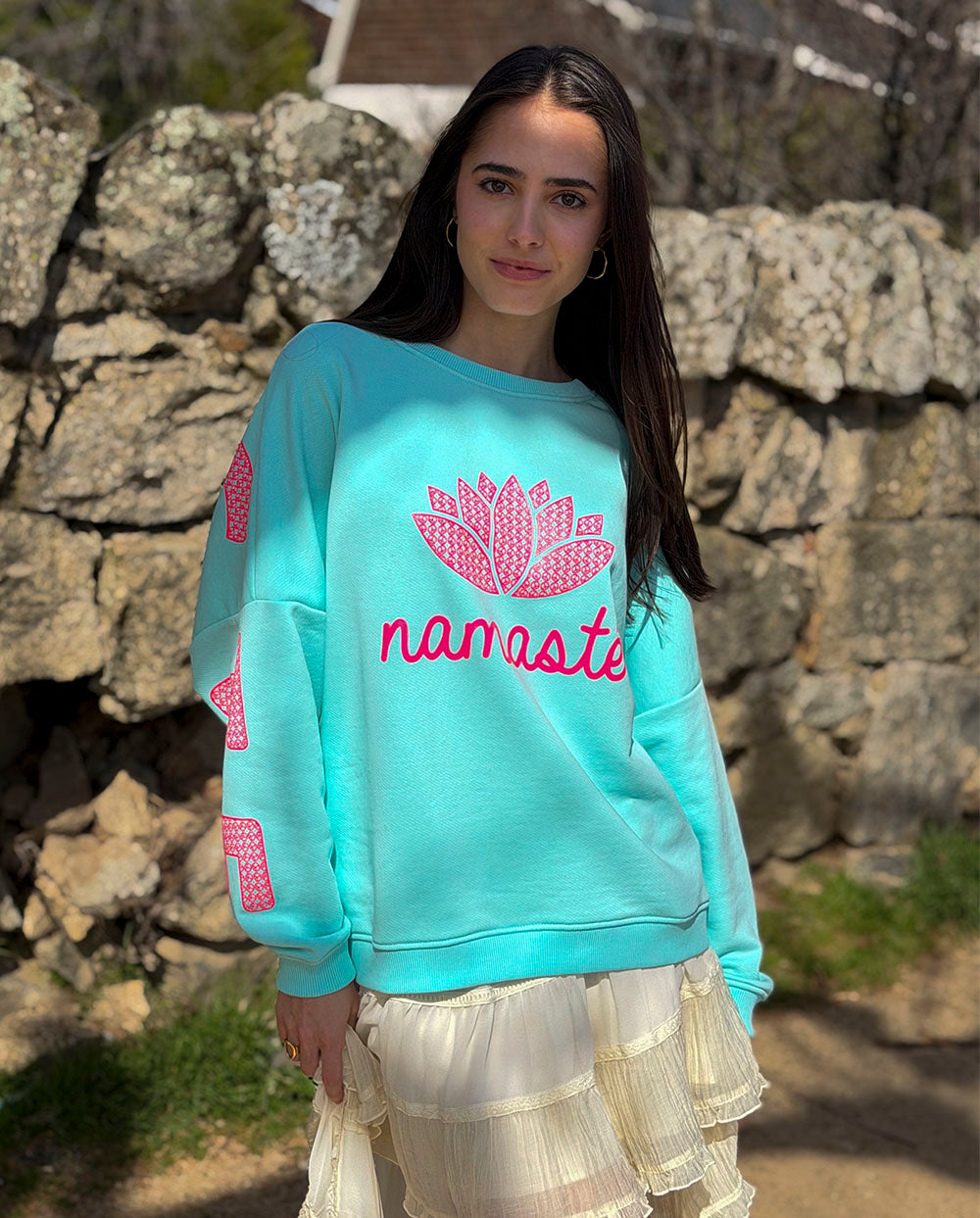 Sudadera Namaste Peace en color azul aqua con estampado rosa neón por delante y detrás recorriendo las mangas el mensjae Namaste ¡un espectáculo!