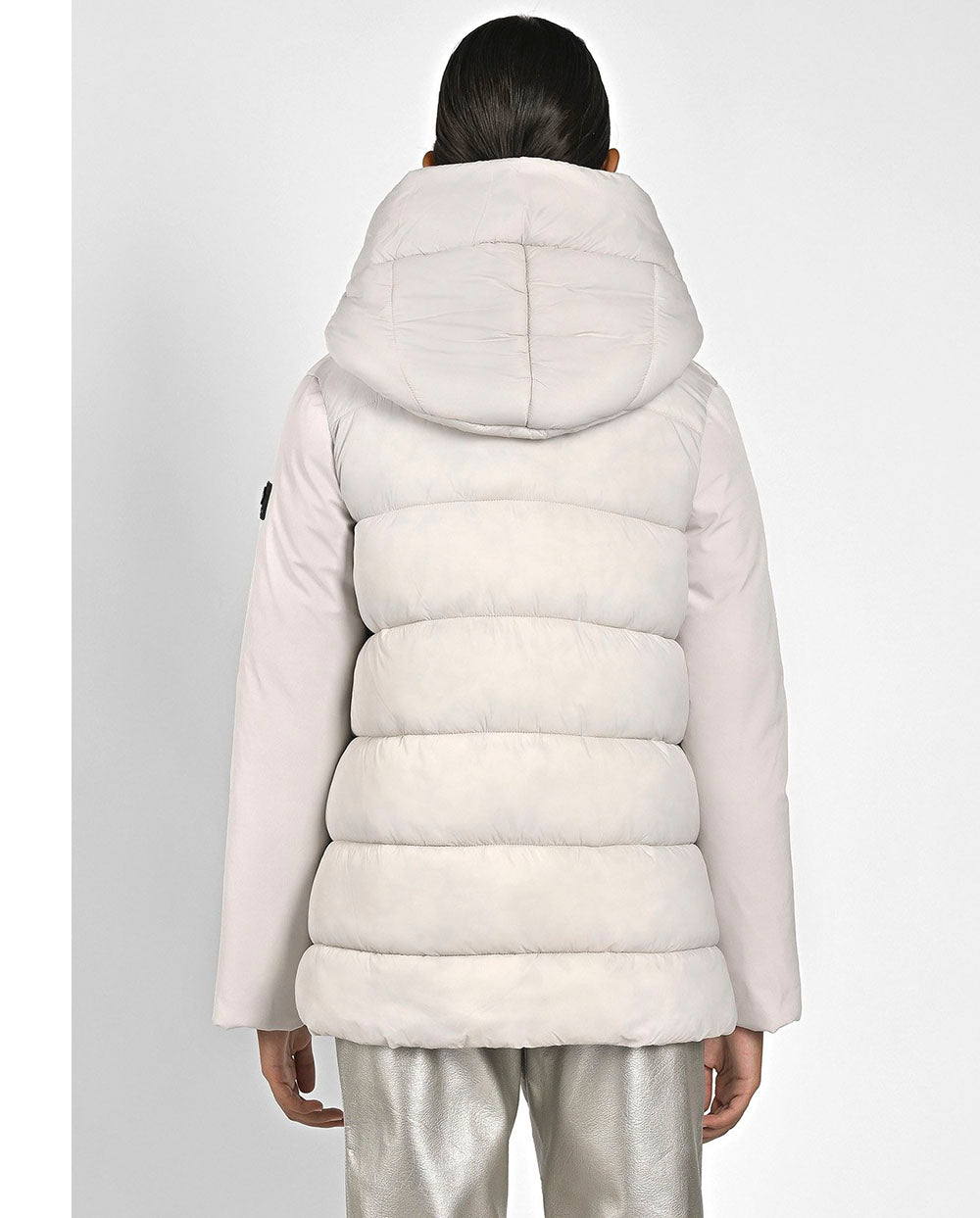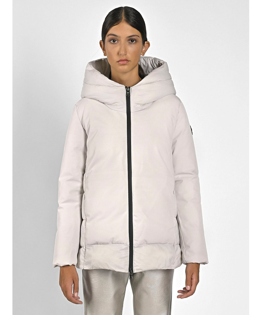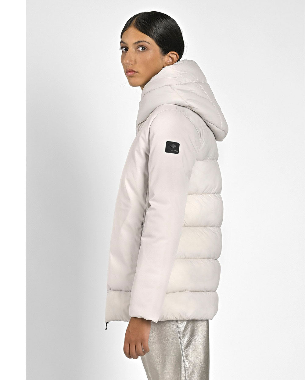 Chaqueta de mujer resistente al agua en color blanco arena. Es ultra ligera e incorpora una capucha integrada y cierre con cremallera oculta, al igual que los bolsillos. El panel frontal y las mangas van en un acabado liso en tejido BIONIC altamente efectivo para repeler el agua que deja deslizar la lluvia.
