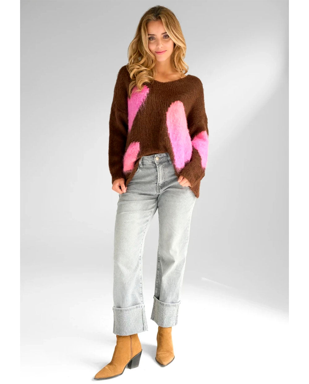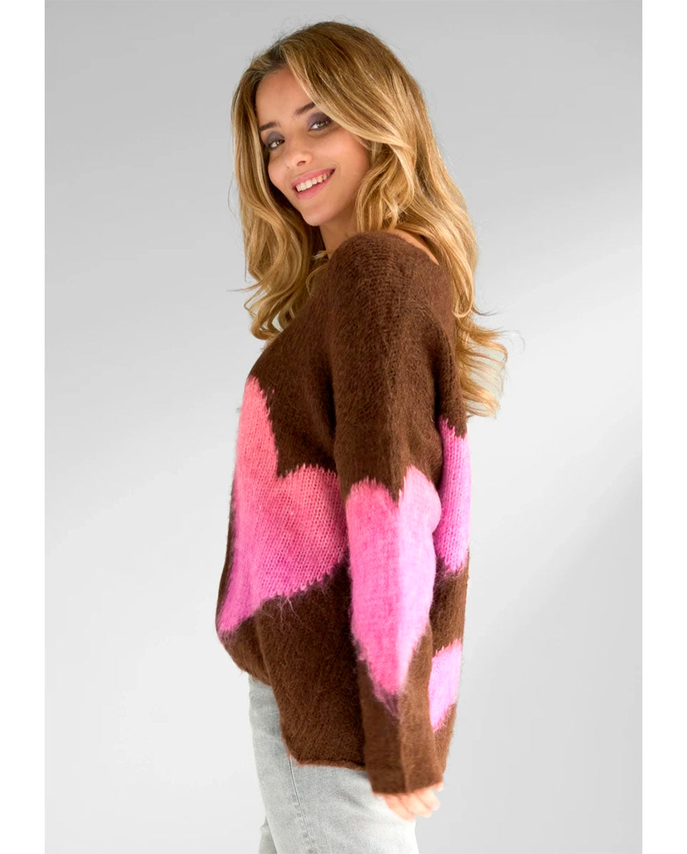 Suéter color chocolate con corazones rosas y escote en uve, fabricado en mezcla de 70 % lana y 30 % alpaca.