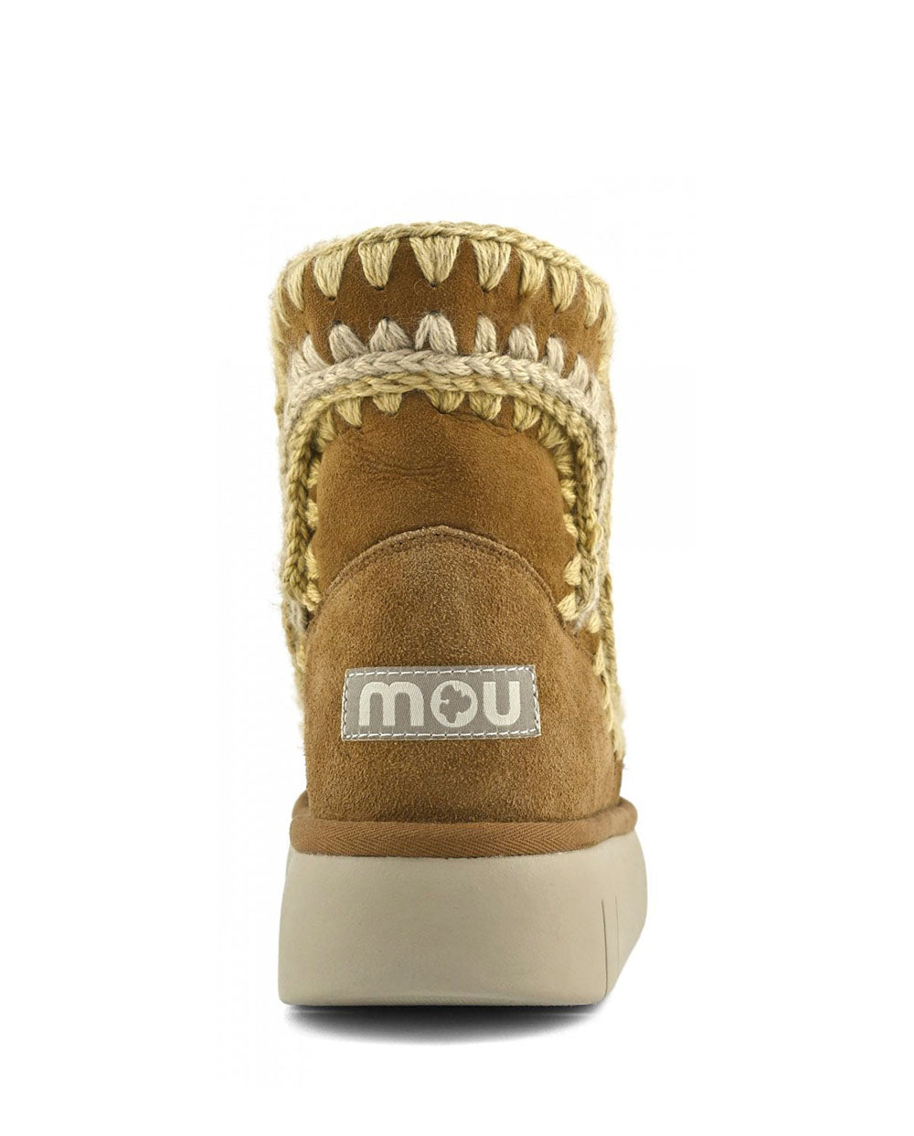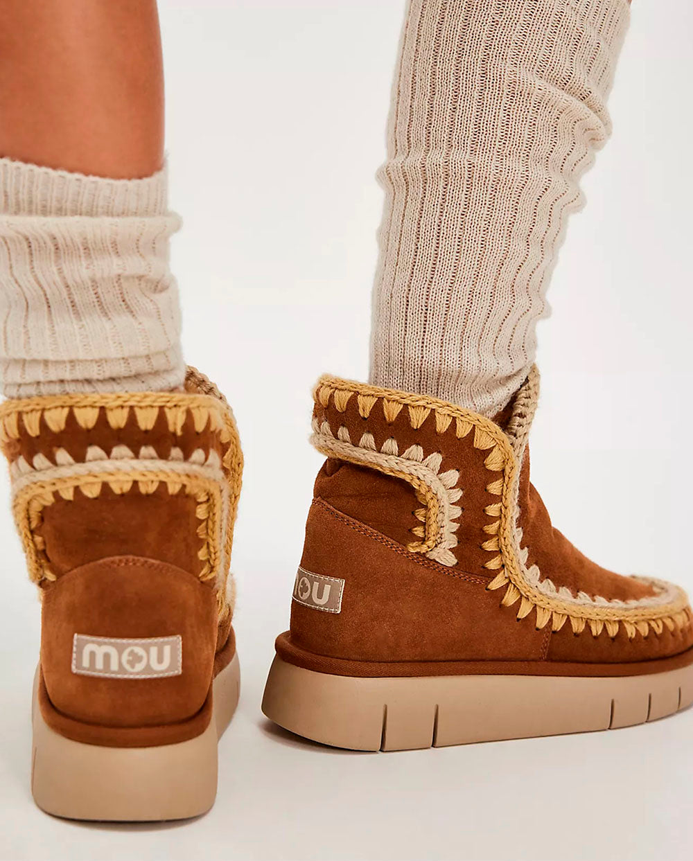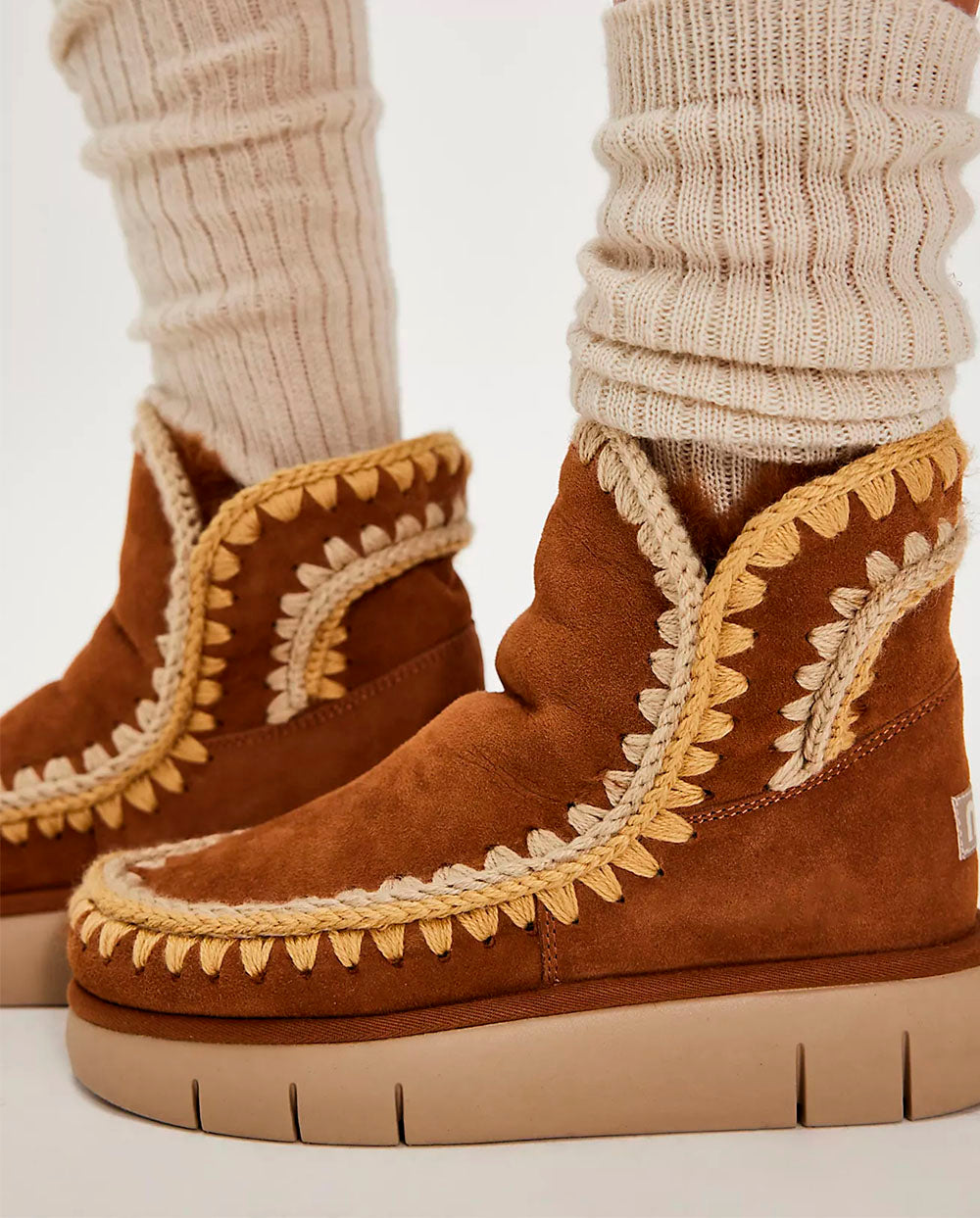 Con toda la magia del diseño de la marca, estas botas están confeccionadas artesanalmente con piel de oveja doble cara divinamente cálida, llevan las  costuras de lana tejidas a mano, características de la marca Mou, un refuerzo en el talón y suela exterior de EVA y goma. Este modelo es ligero, cómodo y resistente.