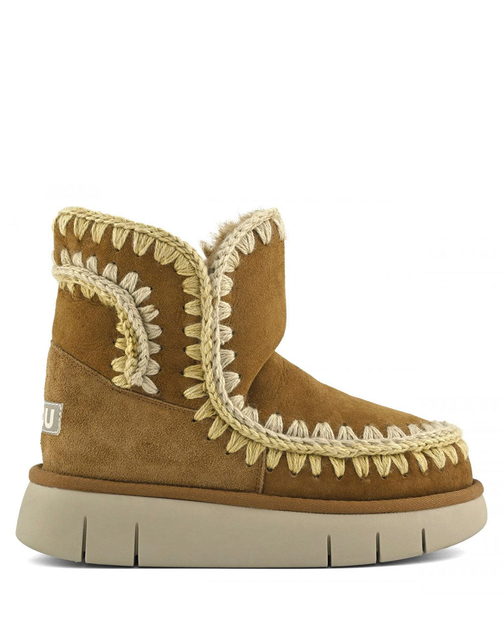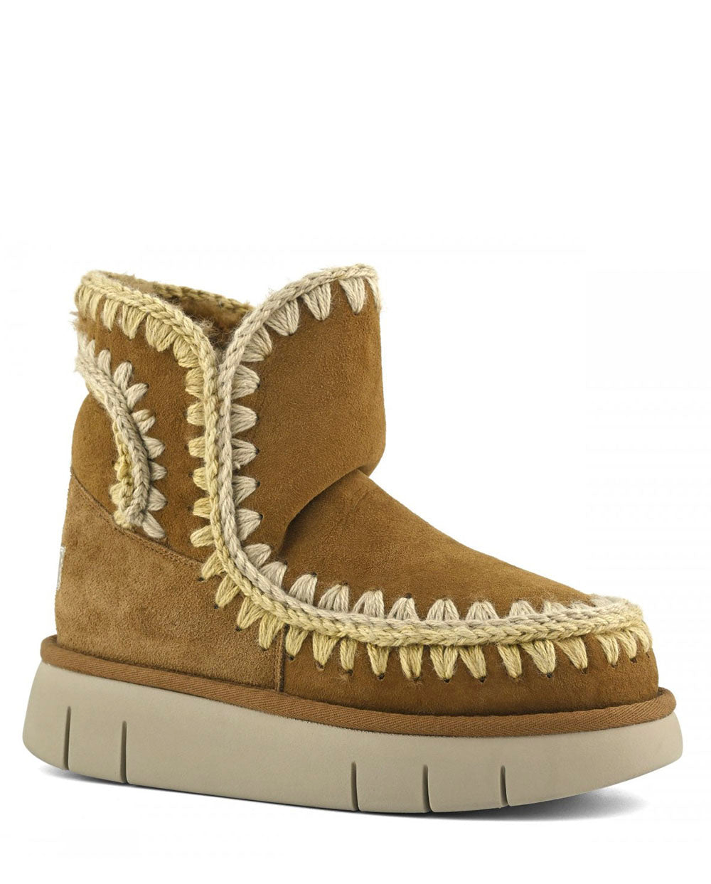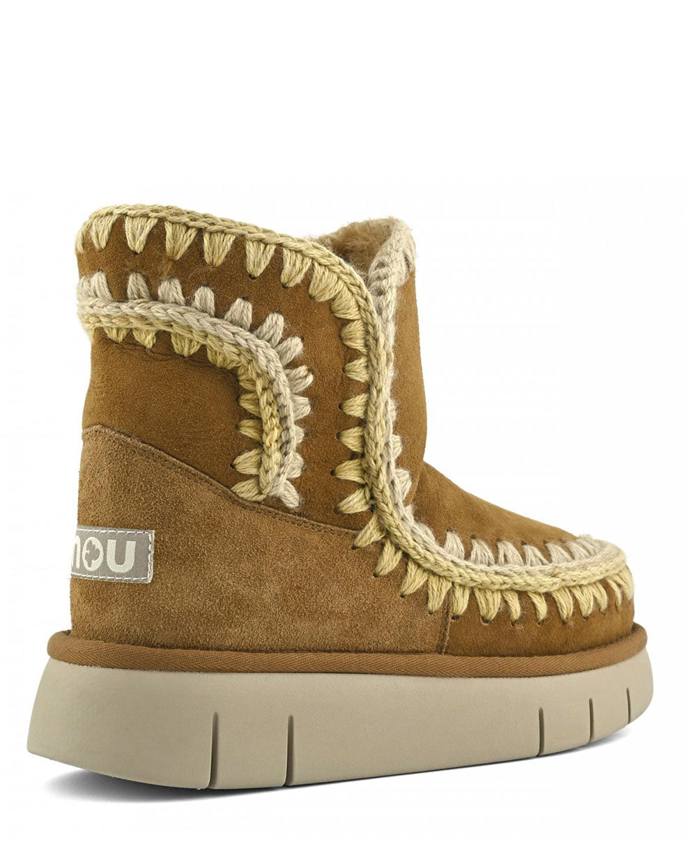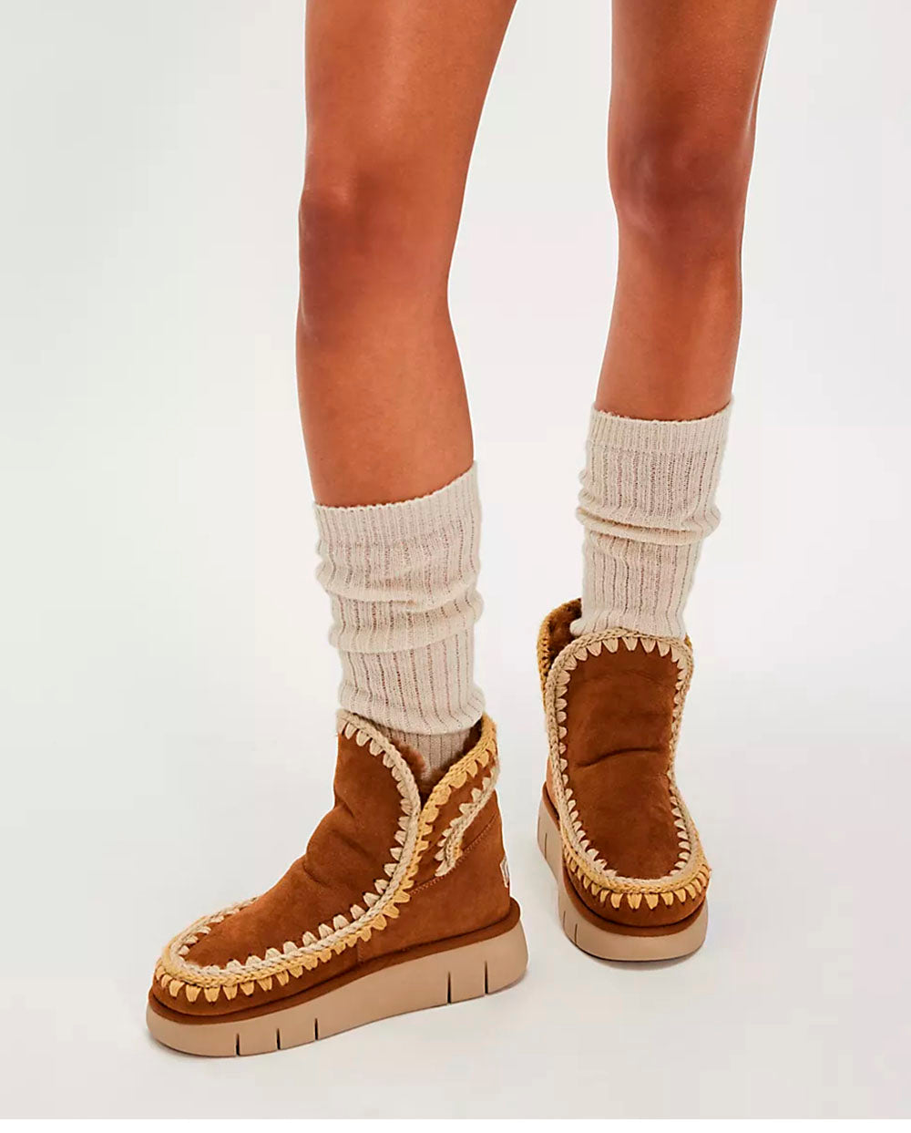 Con toda la magia del diseño de la marca, estas botas están confeccionadas artesanalmente con piel de oveja doble cara divinamente cálida, llevan las  costuras de lana tejidas a mano, características de la marca Mou, un refuerzo en el talón y suela exterior de EVA y goma. Este modelo es ligero, cómodo y resistente.