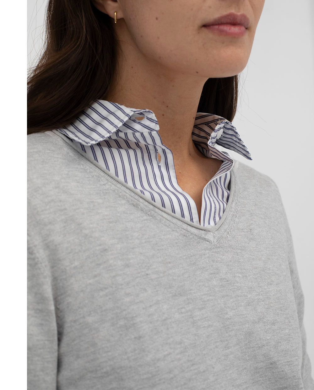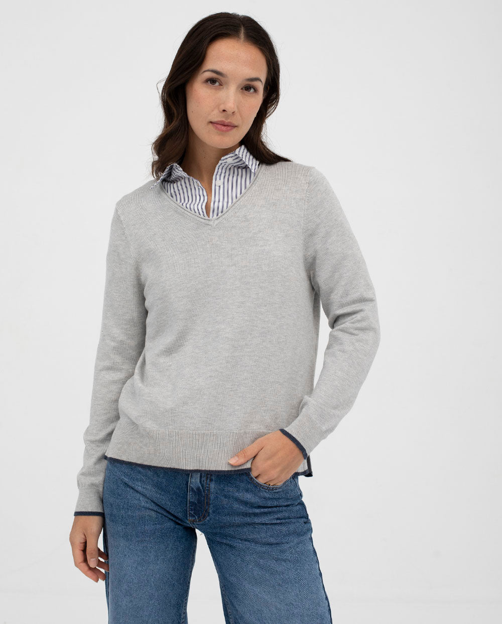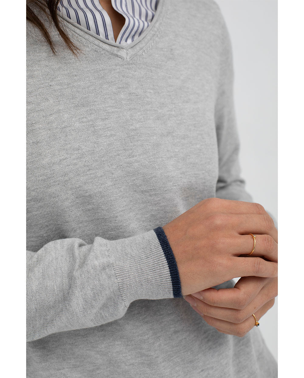 Jersey de punto con escote pico color gris perla, con ribete azul en los puños.