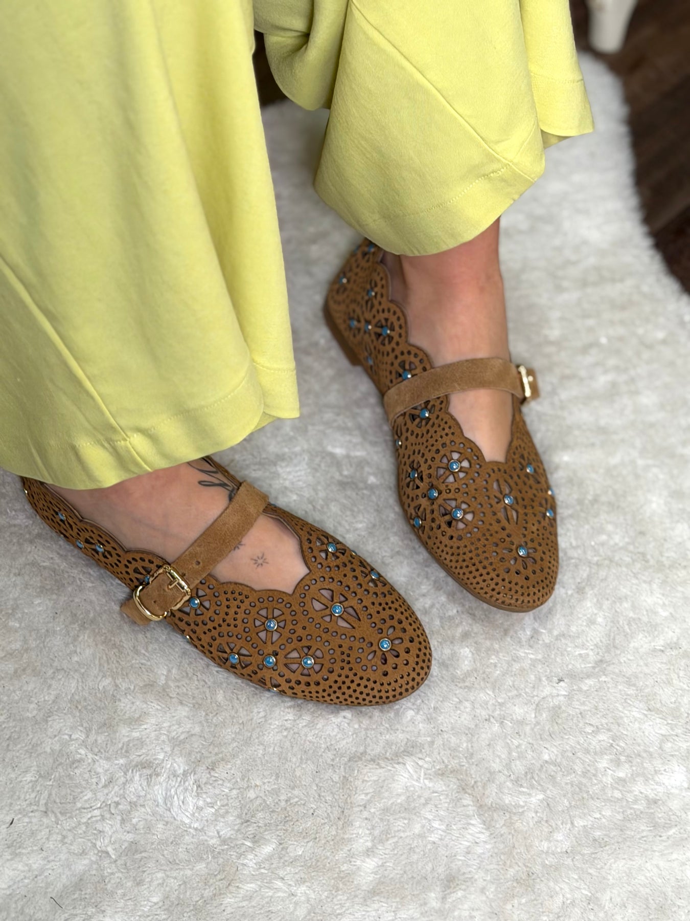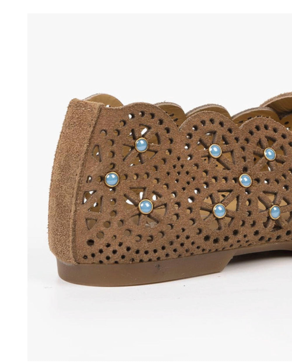 Bailarina de auténtico ante color marrón, con todo el empeine troquelado y decorado con tachas color azul turquesa. Hecho en italia por la firma Mimmú. Ajuste delantero con trabilla.