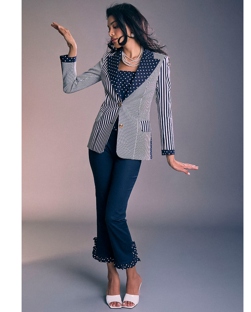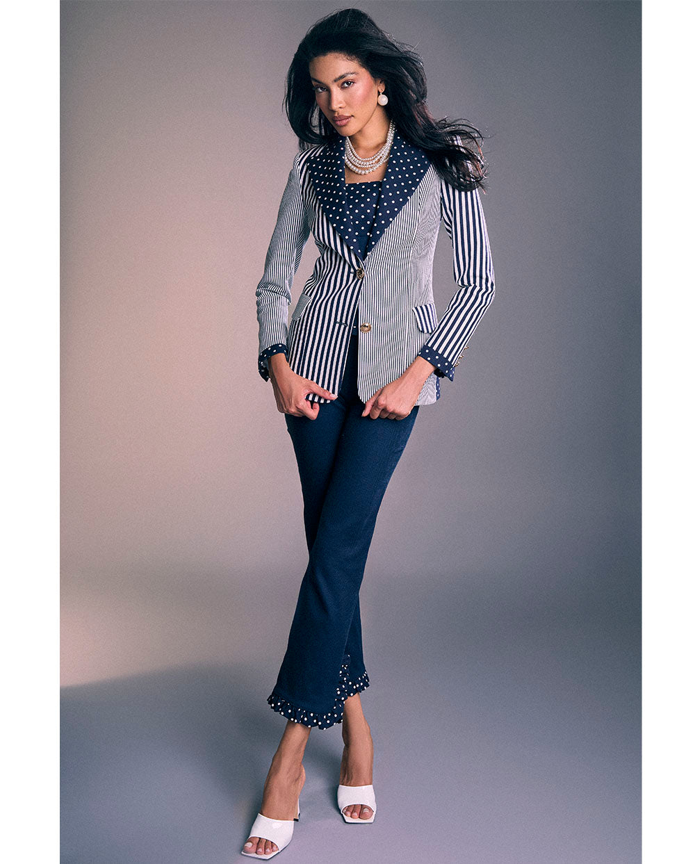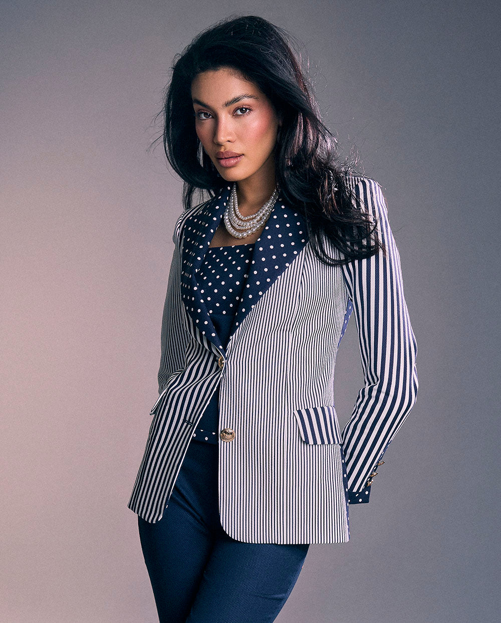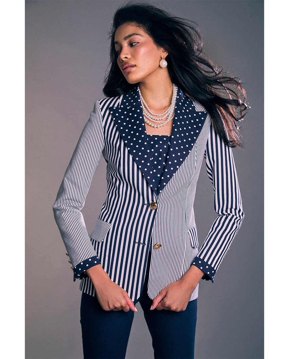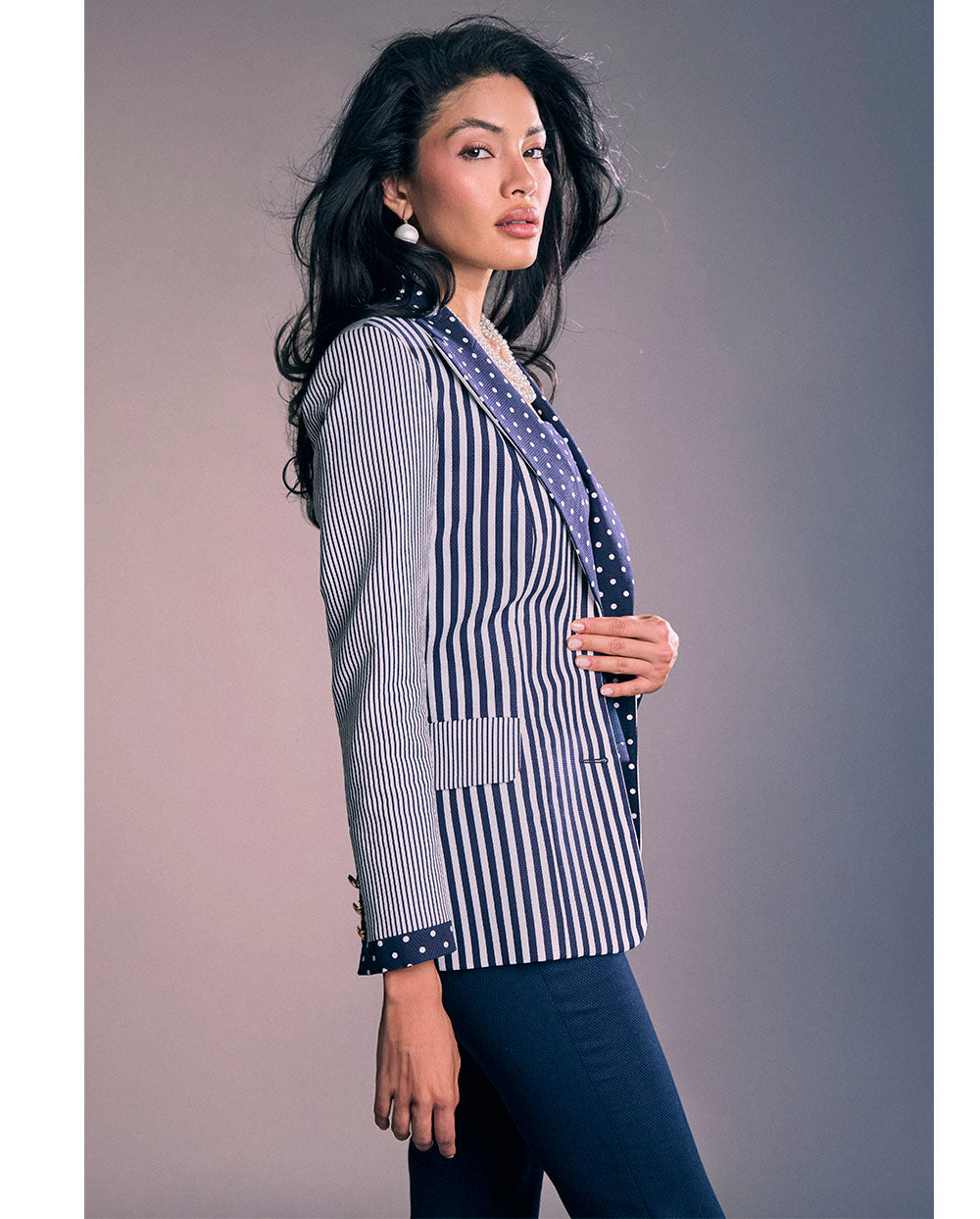 Es una blazer larga combinada con armonía en tres tejidos de tonos navy: rayas y topos en azul marino y blanco. Nos encanta el cuello más oscuro que te dará luz a la cara y su textura piqué.