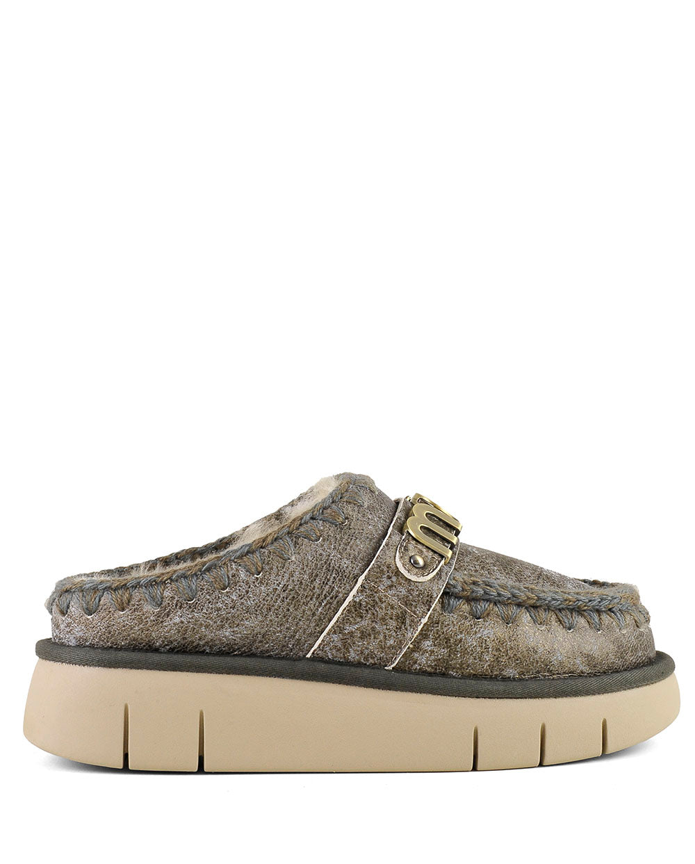 El modelo Bounce clog de Mou en color denim, es un zueco forrado de auténtica lana de oveja. Incorpora la nueva suela ancha super flexible, para que vueles en cada paso con la máxima calidez. Decorado con los pespuntes artesanales de la marca y logo metálico en plateado.