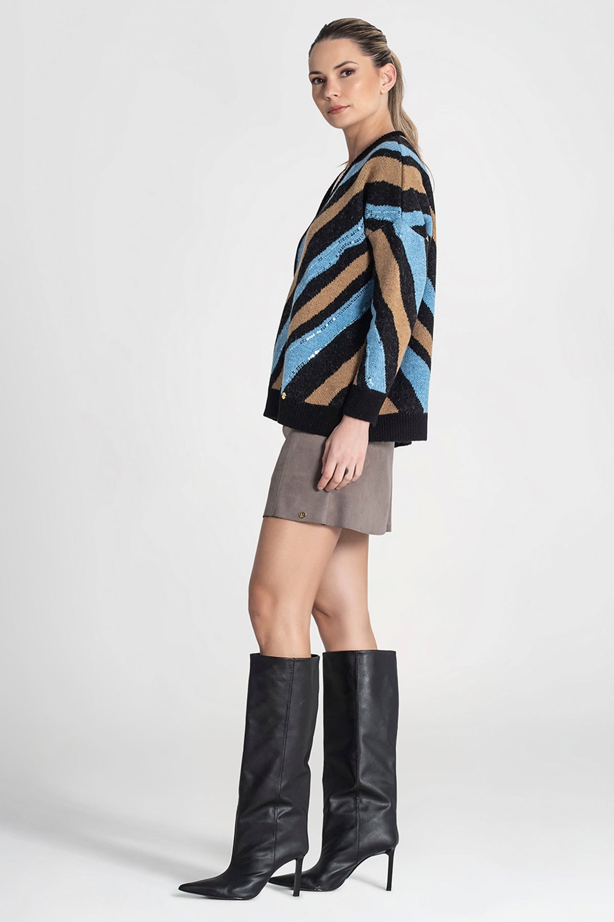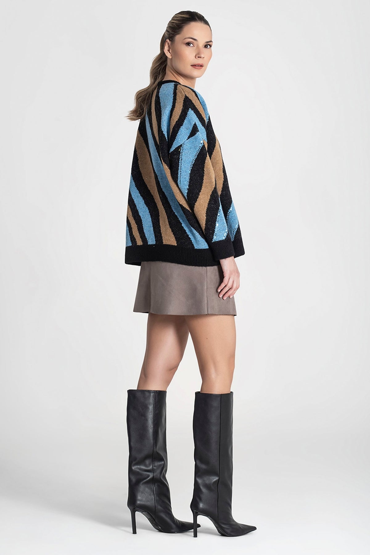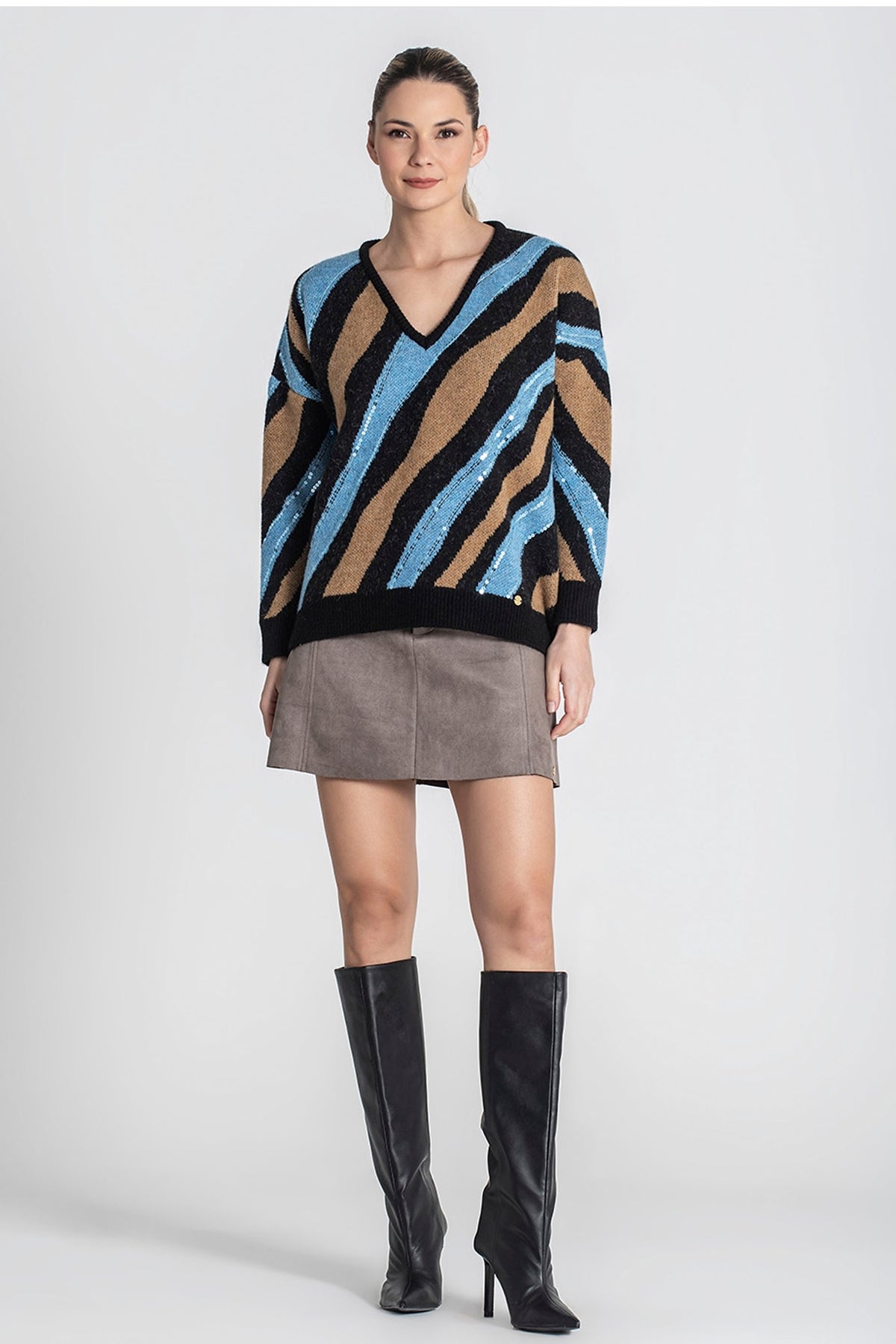 Jersey jacquard con escote pico, estampado animal print decorado con lentejuelas bordadas.