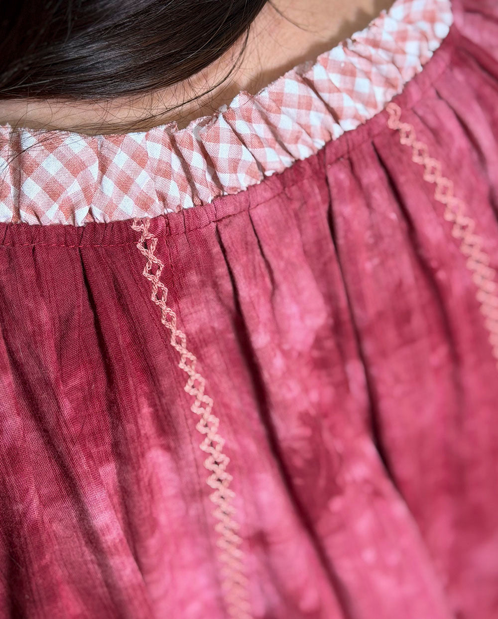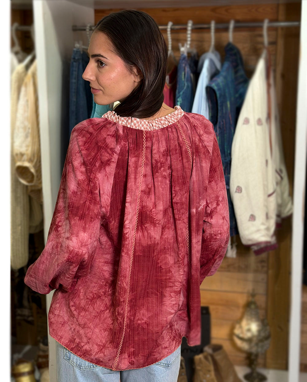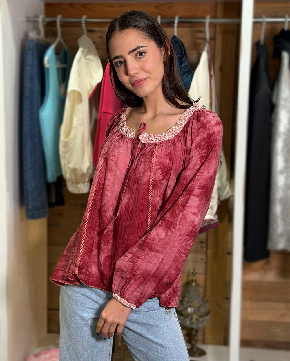 Blusa Abigail em tom verde escuro , com mangas bufantes abaixo do cotovelo. Detalhes bordados na pala, gola com babados, botões dourados envelhecidos e pregas na manga.